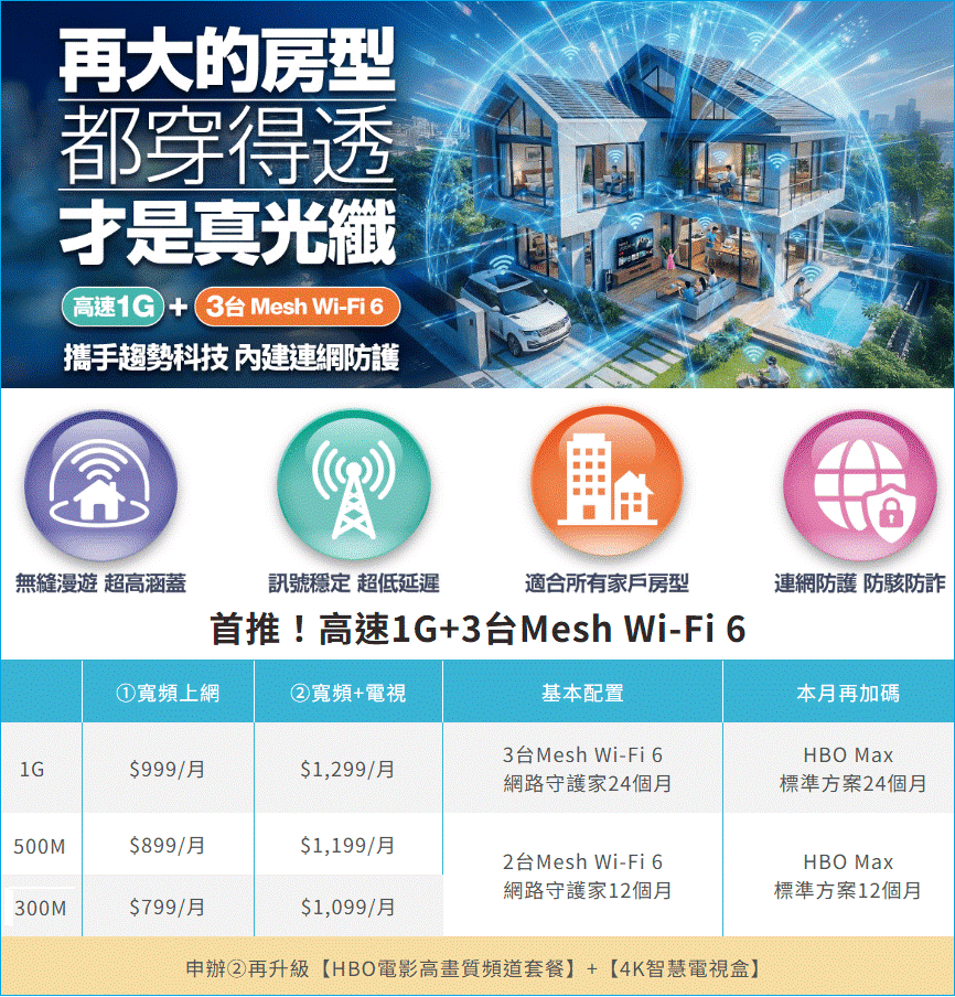 • 申辦150M(含)以上方案,全面免費升級Wi-Fi 6,網速更穩、更快、更適合多人同時上網。