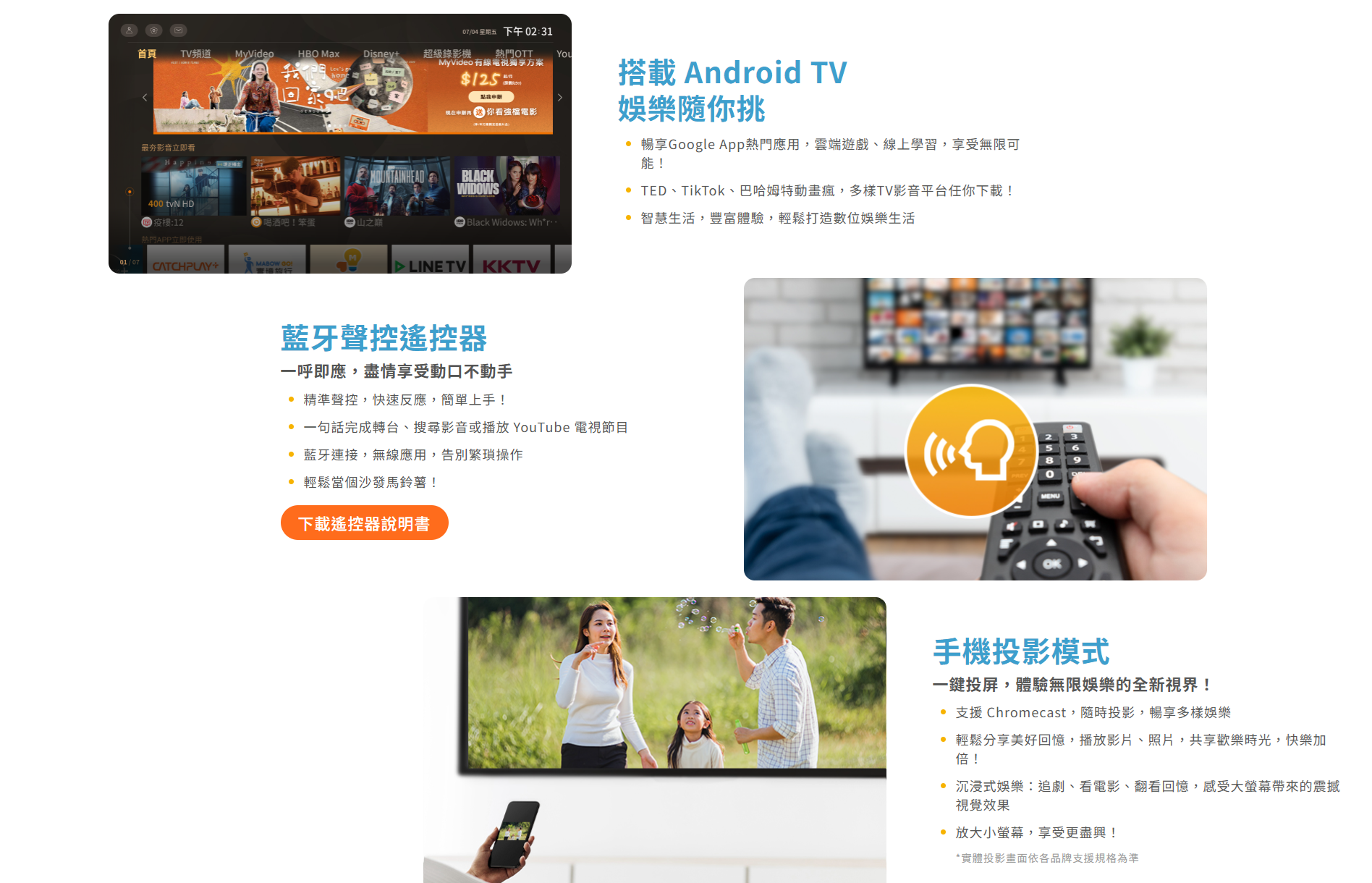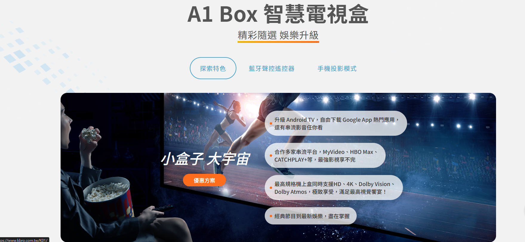免費升級A1 BOX:搭載Android TV,用電視直接看Youtube、MyVideo,大視野大享受。